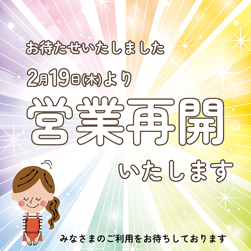 いつも当店をご利用いただき、ありがとうございます。2月19日(木)より営業再開いたします。休業中はご迷惑をおかけし申し訳ありませんでした。みなさまのご利用をお待ちしております^_^